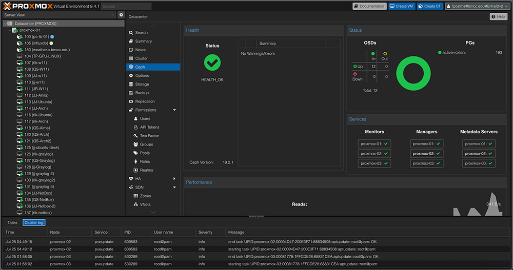 The screenshot demonstrates the lab environment that BMCC provides students with access to perform their lab work in relevant courses. We run several hypervisor servers on premises that students can use to complete their lab work. This setup provides equitable access for students; it does not matter what equipment they personally have. As long as they have a reasonably stable internet connection, they can perform their work from anywhere.